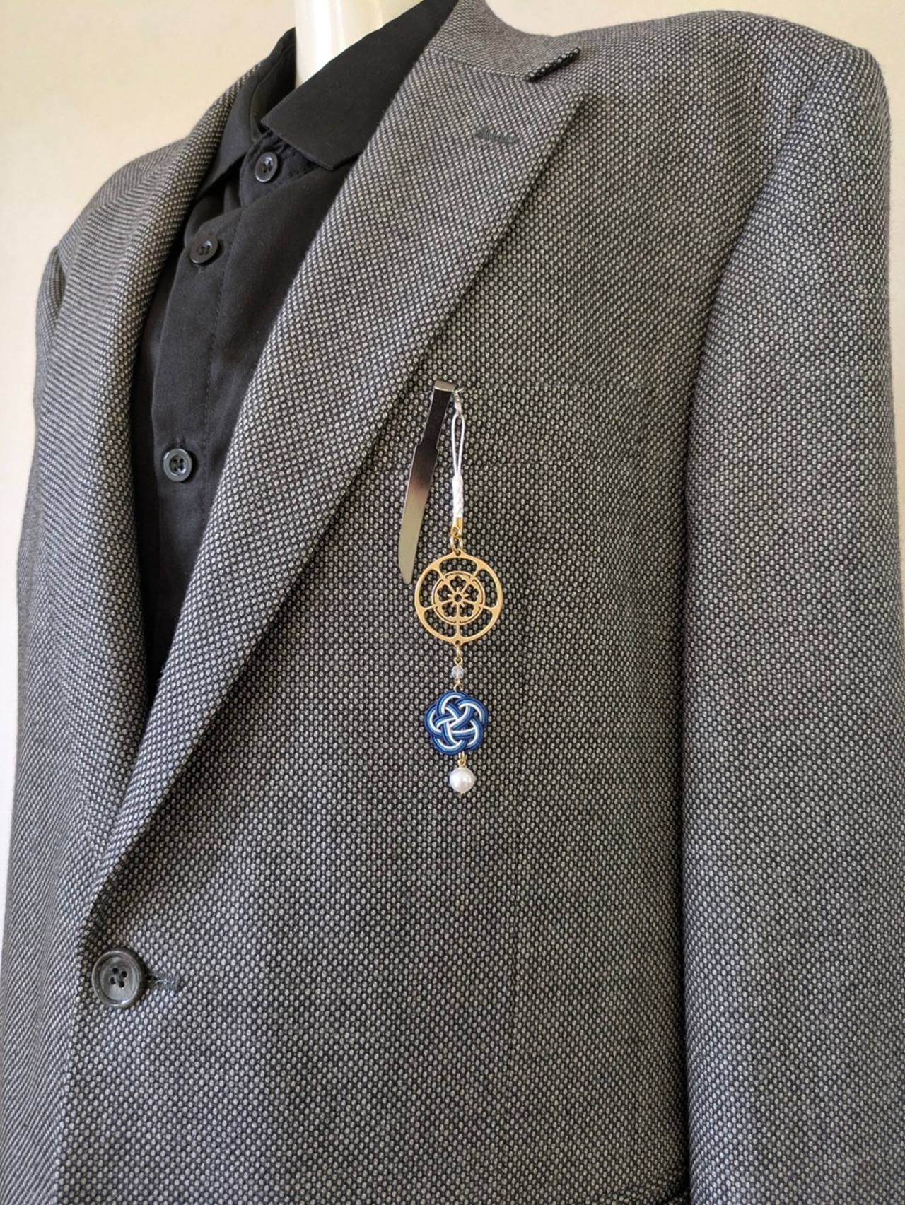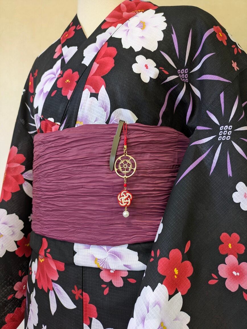 刀をモチーフにしたクリップをストラップの先端に取り付けました。日本では古くから刀は魔除けや守りの象徴とされ、「お守り刀」として身につけられることもありました。バッグや洋服はもちろん、着物や浴衣の帯などにも装着できるアクセサリーです。