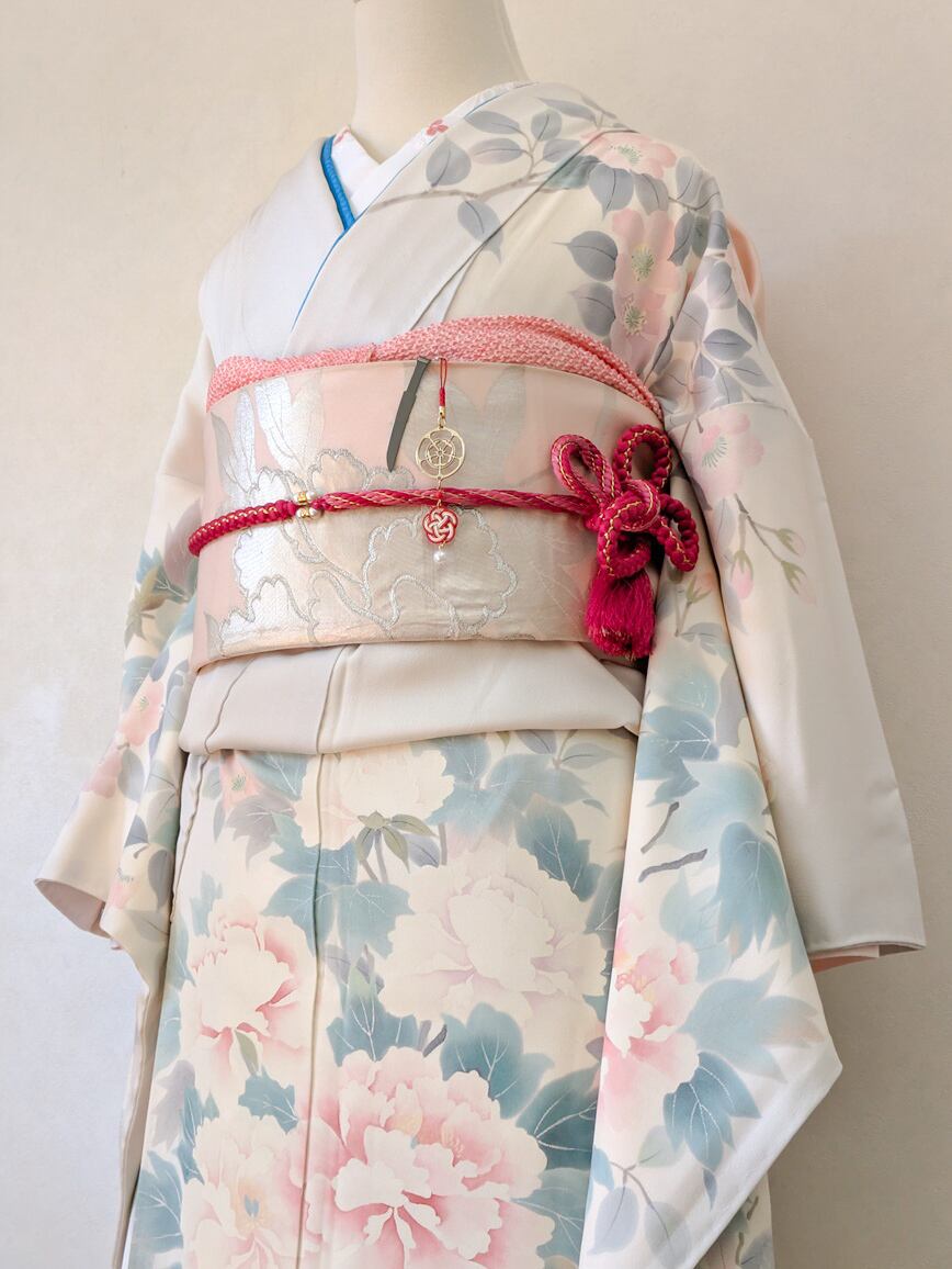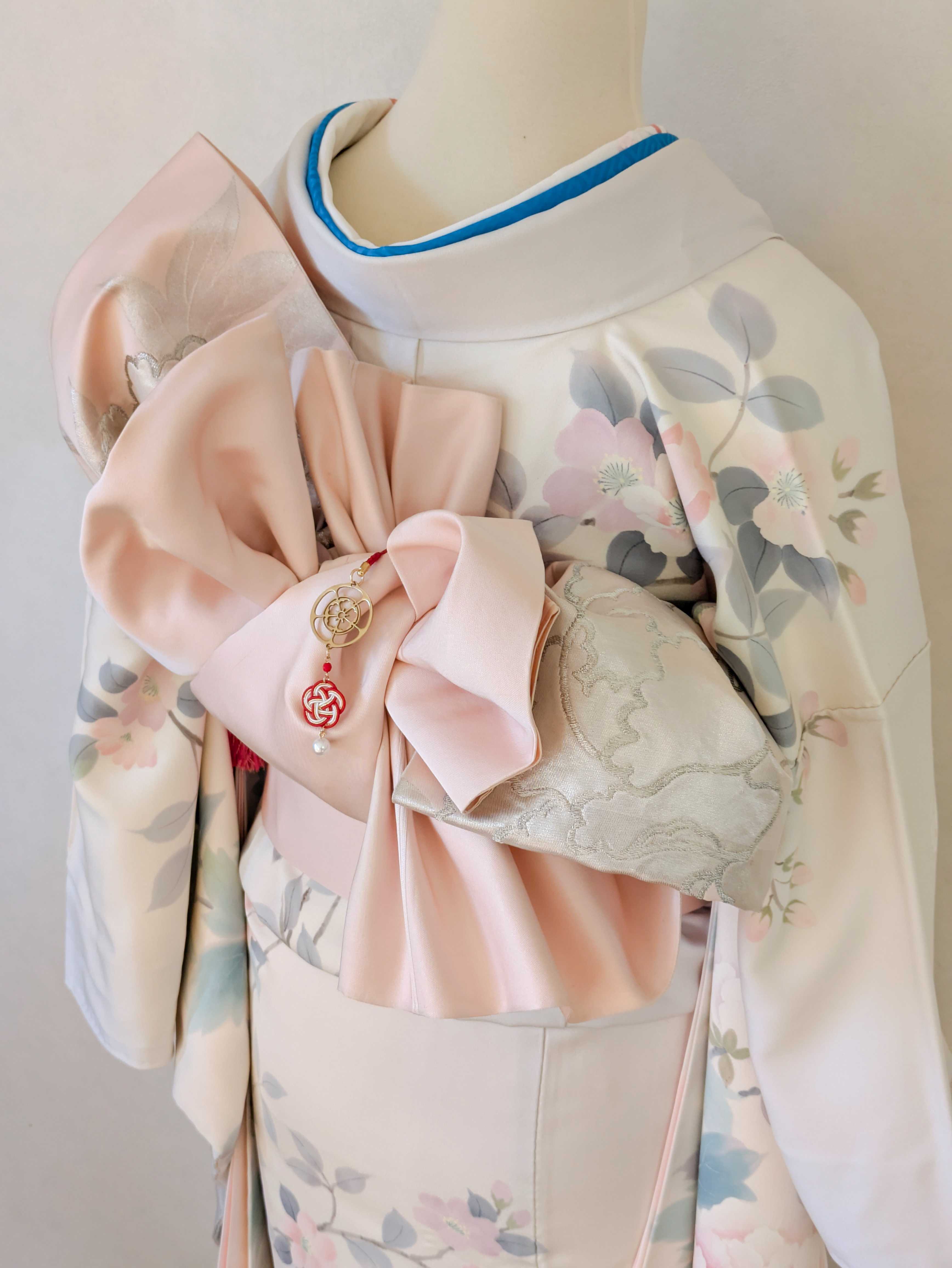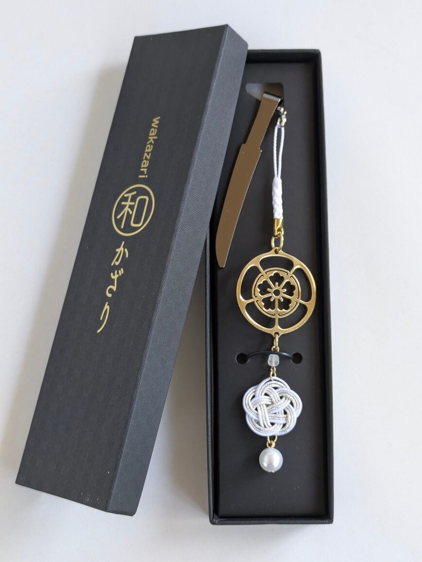 家紋の下には、日本の伝統装飾である水引と、真珠を思わせる玉をあしらいました。水引は日本国内で生産されたものを使用しています。人と人の縁や絆を結ぶという意味が込められています。揺れる装飾が、和の上品で華やかな雰囲気を演出します。