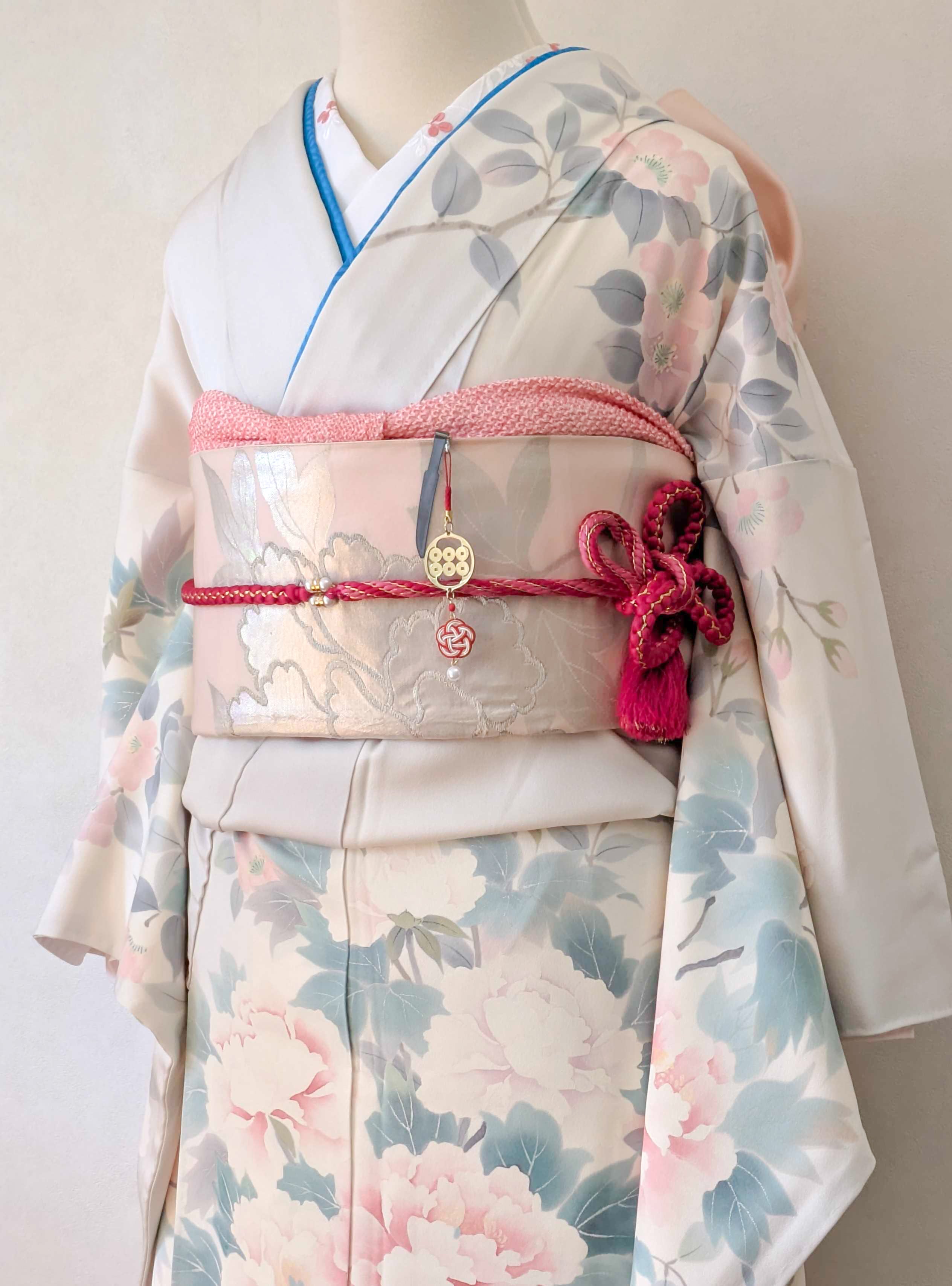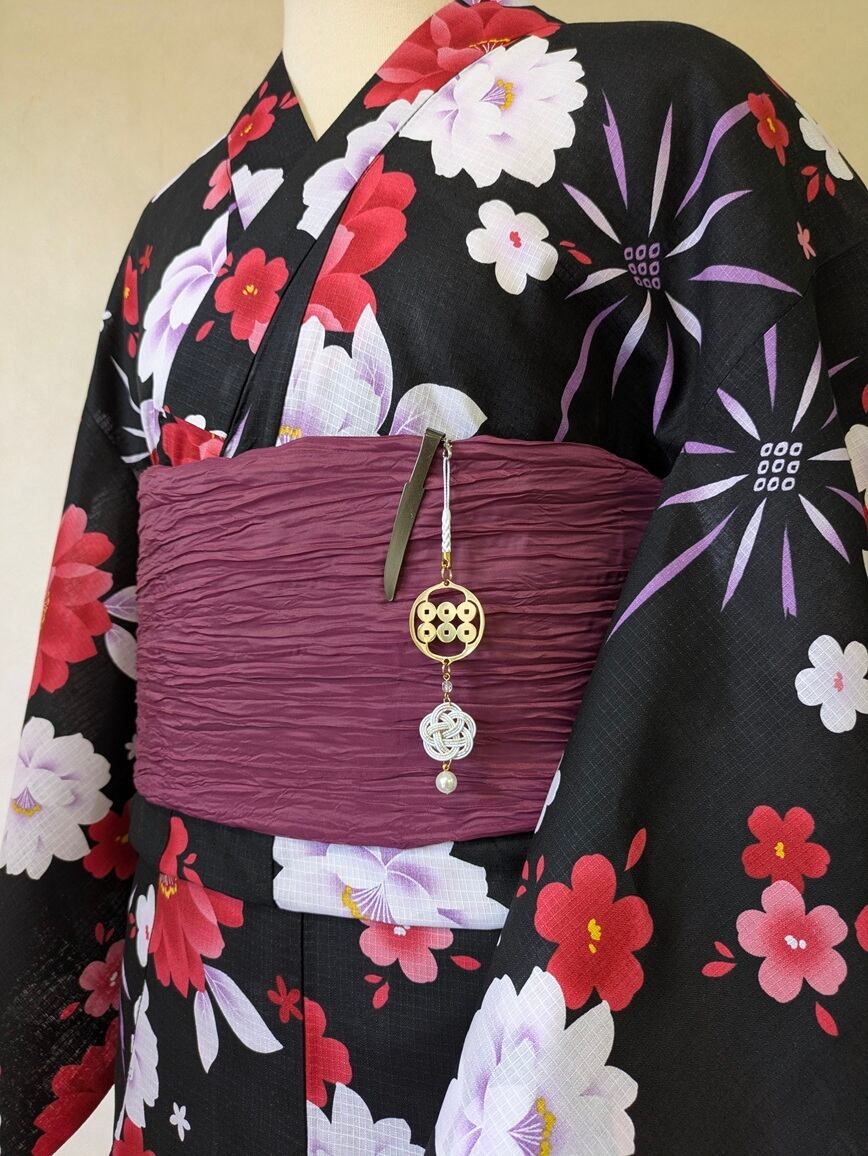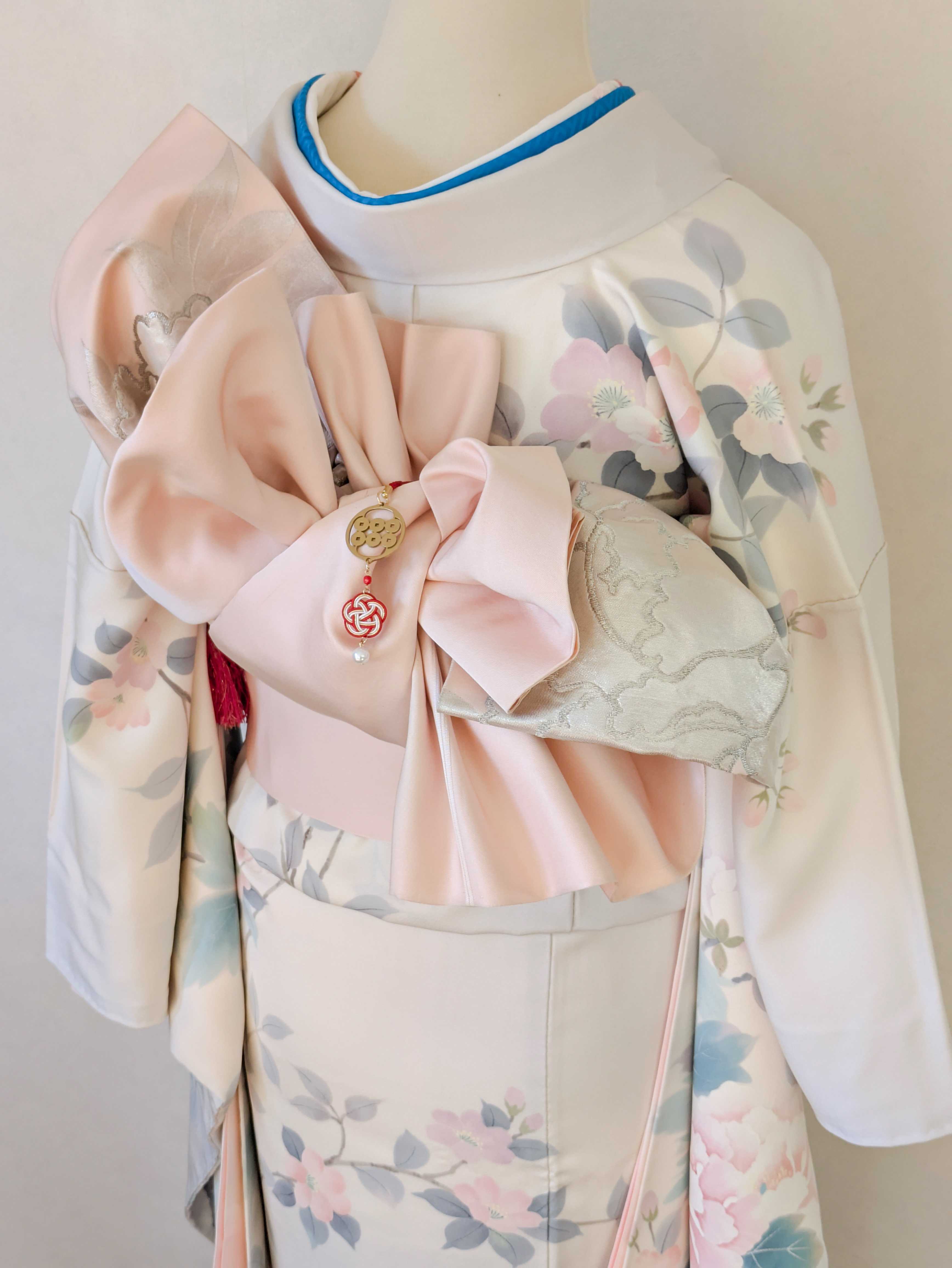 家紋の下には、日本の伝統装飾である水引と、真珠を思わせる玉をあしらいました。水引は日本国内で生産されたものを使用しています。人と人の縁や絆を結ぶという意味が込められています。揺れる装飾が、和の上品で華やかな雰囲気を演出します。