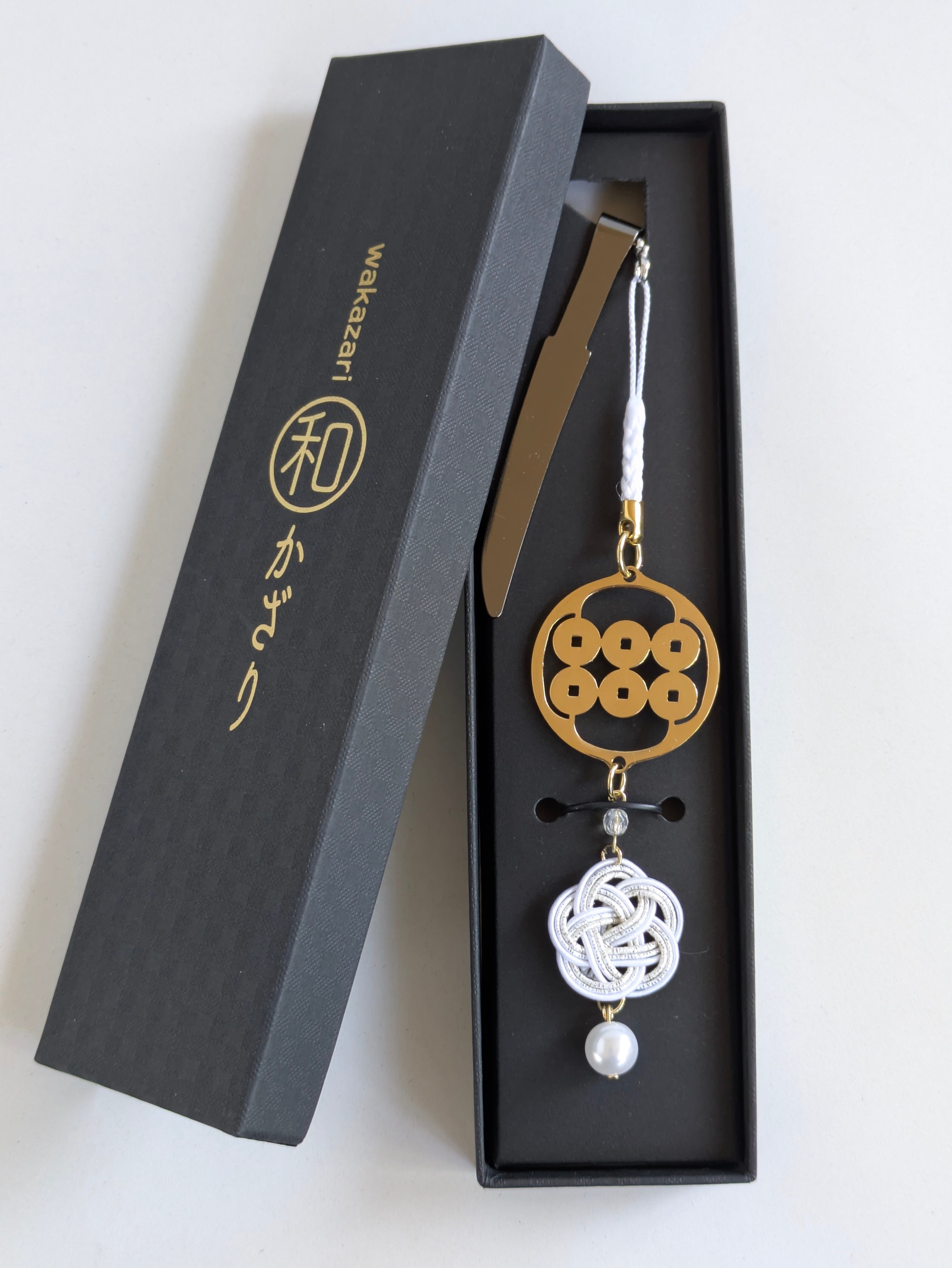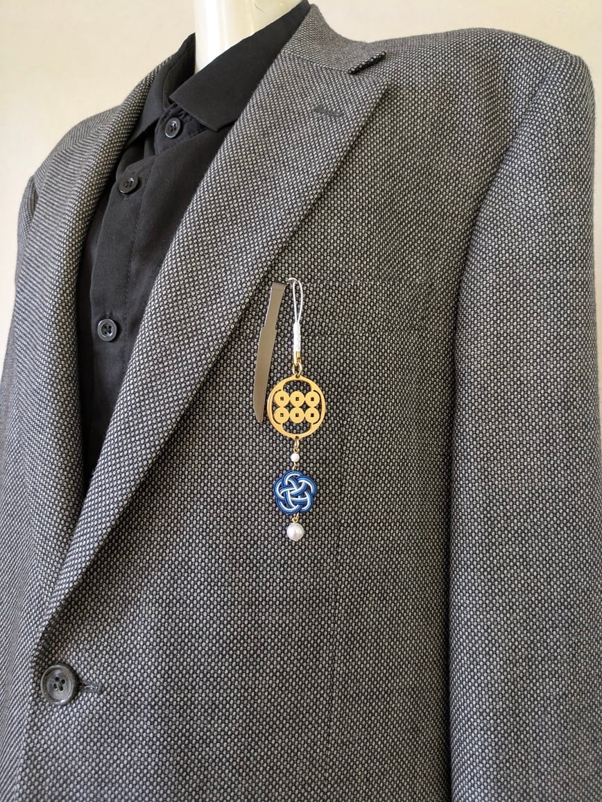 刀をモチーフにしたクリップをストラップの先端に取り付けました。日本では古くから刀は魔除けや守りの象徴とされ、「お守り刀」として身につけられることもありました。バッグや洋服はもちろん、着物や浴衣の帯などにも装着できるアクセサリーです。